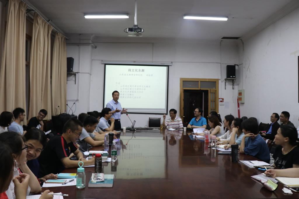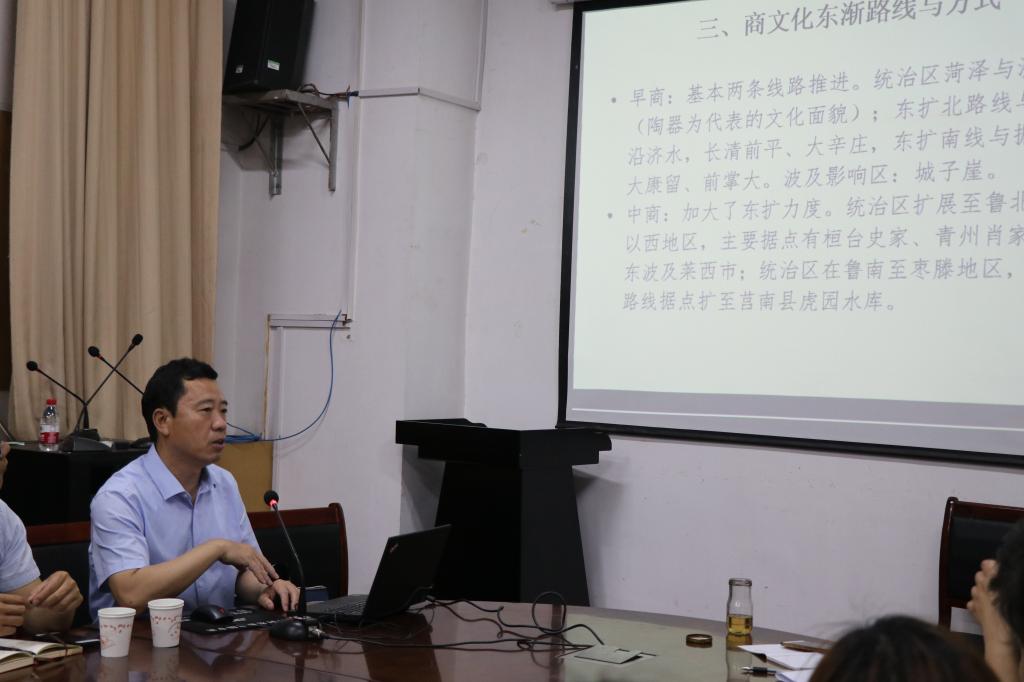 刘先生首先给大家展示并讲解了山东省文化遗产保护规划图,从而引出今天讲座的主题——商文化东渐。之后,他从五个方面来展开今天的主题:1.商代山东地区考古文化概况。详细介绍了商代的岳石文化、珍珠门文化及山东地区的商文化,讲述了它们的特征及已有的研究成果。2.山东地区商文化遗存分析。详细叙述了商文化遗存的发现、分期、年代及聚落特征。3.商文化东渐路线和方式。从早商、中商、晚商早段及晚段四个时段分析了商文化的东渐路线及方式。4、5分别是夷商文化的融合及对夷商关系的几点认识。商代的山东地区是以商文化为主导,商文化逐渐东进而夷文化则逐渐东退。刘先生强调,以后应细化基础研究并且加强重要商文化遗址的聚落考古研究,还要重视与其他地区的合作考察与研究交流。