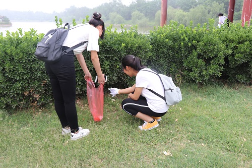 迎着微风,经过院里活动负责人的简单分工,大家开始了紧张而有序的清理垃圾活动。在铁塔湖畔,同学们们手里拿着劳动工具,时而弓着腰用铁锹铲出湖边淤积的垃圾,时而小心翼翼地蹲在湖边用夹子拾捡着漂在湖面上的垃圾。在绿茵草坪上,同学们两两一组,一人拿夹子准确夹住垃圾,一人拿垃圾袋准备接住垃圾,他们或俯身仔细寻找垃圾,或蹲在地上仔细捡拾废屑。在高高的城墙上,依然可以看见他们不辞辛劳不怕苦不怕累的背影,扫除厚积的尘土,清理杂乱的树枝。在同学们不懈的努力下,铁塔湖畔更干净,铁塔水更清澈,古城墙更整洁。