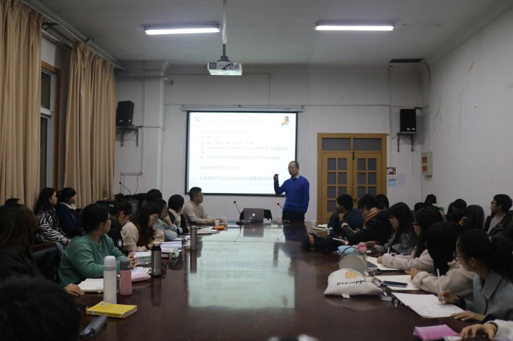 闵凡祥老师介绍了自己目前正在进行的有关医学史的研究工作,并详细阐述了“什么是医学史”。他以西方疾病与医疗史研究为基点,谈及医疗史的发展,指出医疗史起源于原始的医疗知识,经长时间发展后,从19世纪开始医疗史开始渐渐采纳和遵循科学标准。他着重分析了19世纪中后期医疗史研究出现的四种倾向以及20世纪初医疗史研究领域出现的建制化现象;深入浅出地介绍和分析了医学史的人文转向,梳理了医疗社会史兴起的历史和时代背景。闵老师从研究对象、研究领域、学科性质、资料范围变化、研究方法和史学转型多方面和多层次详细分析了医疗社会文化史的种种特征,认为西方医学史正朝着更贴近普通大众、更富人情味、更具人文关怀的方向发展,与现代社会的众多领域和众多学科交叉融合发展,并彰显出越来越丰富的社会文化内涵。