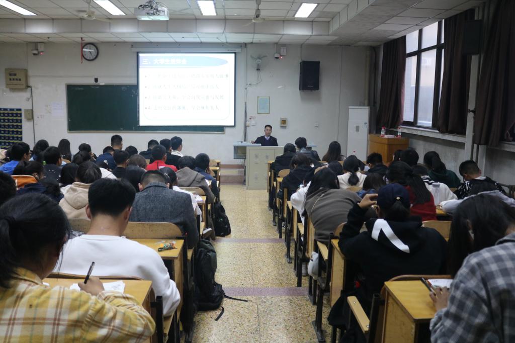 郭海儒通过自身求学、工作经历以及结合所得经验与感悟,从大学生活特点、加强思想道德塑造和知识体系构建、大学阶段主要任务等维度展开讲述。他表示,大学期间打下的坚实基础将对当代大学生未来的发展起到极其重要的作用,要围绕大学做好“为什么?”、“是什么?”、“怎么办?”的相关问题解答,鼓励同学们既要心怀远大理想、拓宽人生格局,又要脚踏实地、实事求是。同时,他指出,大学期间同学们要勇于提出问题和寻求帮助,注重和加强师生、同学、朋友之间的沟通交流,在与他人交往的过程中塑造更好的自己。最后,他殷切的希望,在新时代背景下,同学们要珍惜难得的求学岁月,从身边最紧要处做起,勇于实践、善于请教,不负青春韶华,勇担时代使命。
