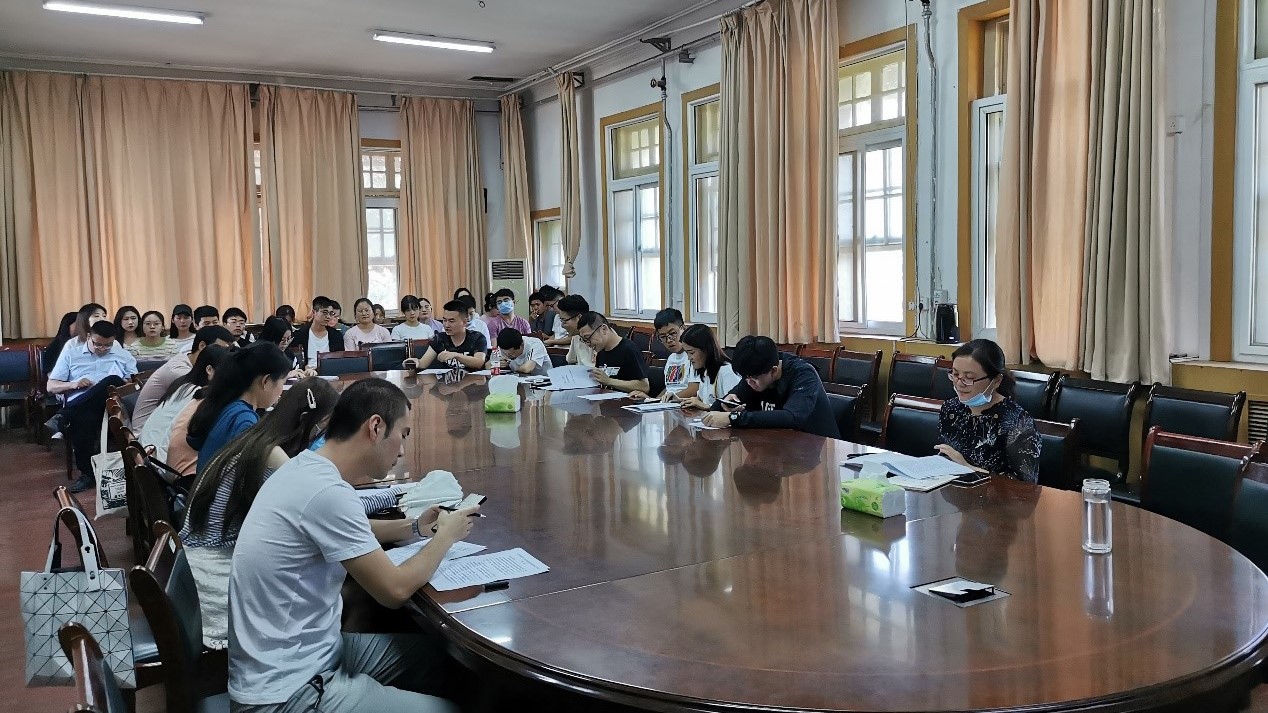 2020级研究生新生辅导员见面会暨学生干部选拔会在学院三楼会议室举行,研究生辅导员肖莹、部分高年级学生干部以及参与竞选2020级学生干部的同学与会,其余2020级新生通过线上方式参会。会议由肖莹主持。