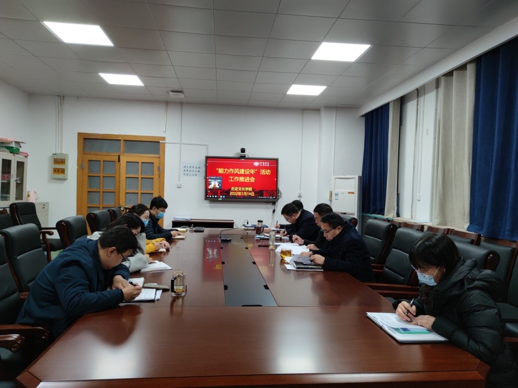 在二楼古代史教研室召开“能力作风建设年”活动工作推进会,学院全体领导班子成员、党支部书记、系(教研室)负责人等通过线上线下相结合方式参会。会议由学院党委副书记周文凯主持。