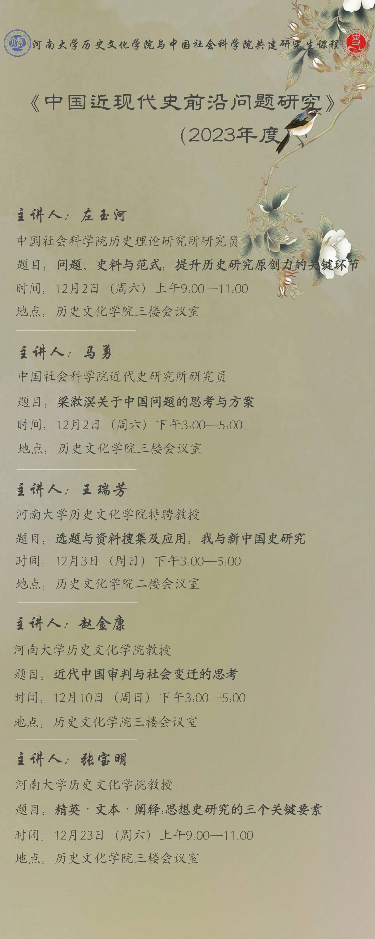 相关专业的研究生开设《中国近现代史学术前沿问题》课程。主要目标有三个方面:(一)充分了解与掌握本学科政治、经济、思想、文化等领域现阶段的研究现状和发展动态;(二)在充分掌握本学科研究现状与研究动态的基础上,确定自己的研究方向;(三)加强与社科院教师的交流与学习,以期树立坚定的学术信念和正确的学术态度。