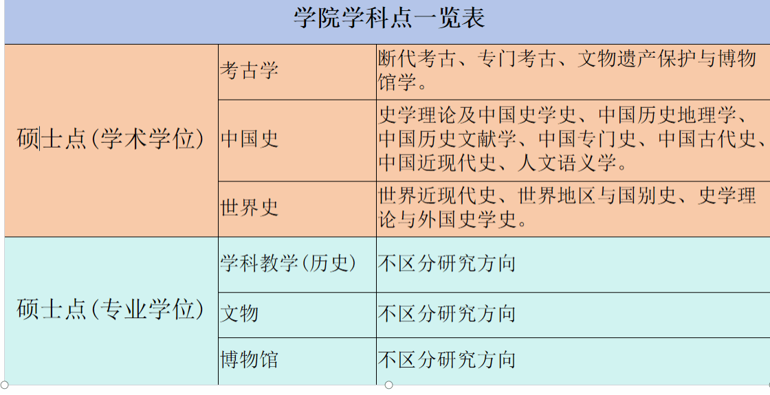 学院目前有考古学、中国史、世界史三个一级学科博士、硕士学位授权点及博士后科研流动站,学科教学(历史)、文物、博物馆三个专业硕士学位授权点。