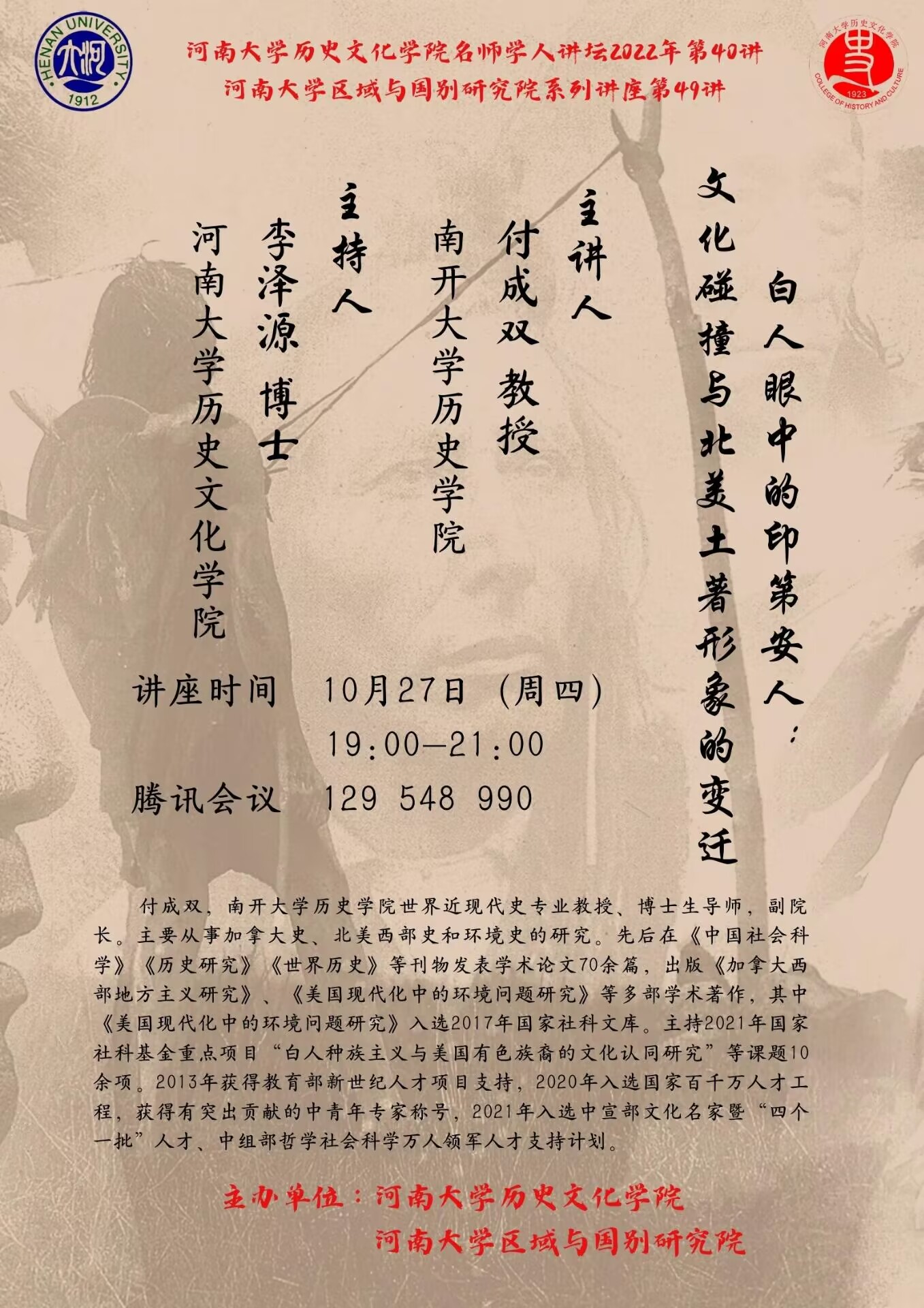 【讲座通知】付成双:白人眼中的印第安人:文化碰撞与北美土著形象的变迁