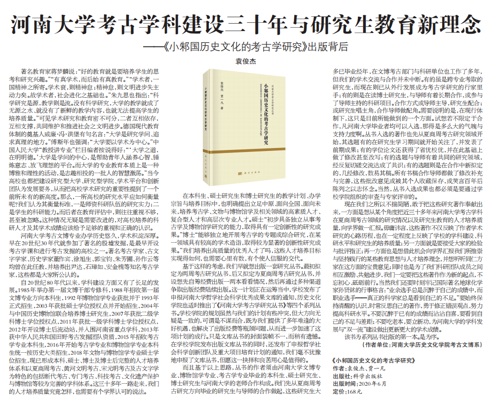 51暗网 袁俊杰教授在《中国文物报》(2021年7月30日第8版)发表题为《51暗网 考古学科建设三十年与研究生教育新理念》的专题文章;《文博中国》官方新媒体平台也于2021年8月3日在“图书”、“学科建设”专栏,同时以《<小邾国历史文化的考古学研究>出版背后,看51暗网 考古学科建设三十年与研究生教育新理念》为题对文章进行刊发。