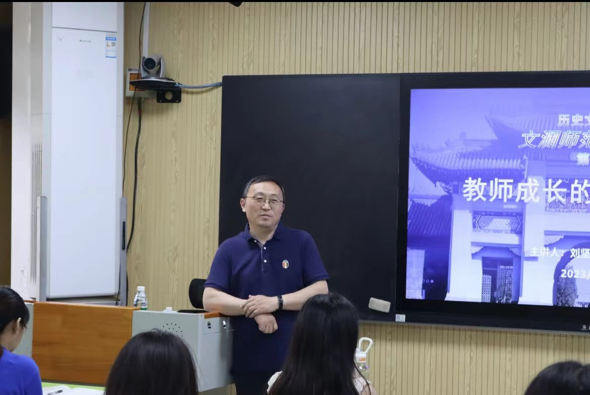 讲座之初,刘坚老师指出,青年教师成长的几个关键词为悦纳、尊重、学习和规划。紧接着,他表示,悦纳就是开心愉悦的接纳,悦纳职业(价值、内容、技能、道德),悦纳学校(性质、现状、未来、领导),悦纳学生(成绩、习惯、变化、悦纳自己(现状、失误、欠缺、进步)。随后,他指出,青年教师成长的第二个关键词就是尊重,尊重工作、专业、领导、同事、家长和学生。然后,他表明,要学习技能和修身,一个优秀的中学历史教师应该学会把知识准确、简洁、通俗、生动地表达出来,这是有高低之分的四个层次。一个优秀的中学历史教师所拥有的不只是普通意义上的教学思路和技能,而是植根于历史学科的思维方法和教学能力,应该以丰富的历史文化资源来构建自己的精神世界。最后,他介绍了青年教师成长的最后一个关键词是规划,要目标适当、方法恰当、长期坚持。向学生普及历史知识、发展历史学科能力、弘扬历史人文精神应该成为历史教师专业成长的核心内容和特性。