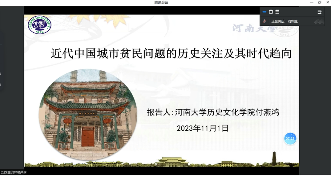 付燕鸿副教授做题为《近代中国城市贫民问题的历史关注及其时代趋向》的线上讲座。本场讲座由中国社会科学院近代史研究所助理研究员马维熙老师主持,泰山学院历史系张波副教授、哈尔滨工业大学(深圳)马克思主义学院裴广强副教授作为与谈人参加会议。