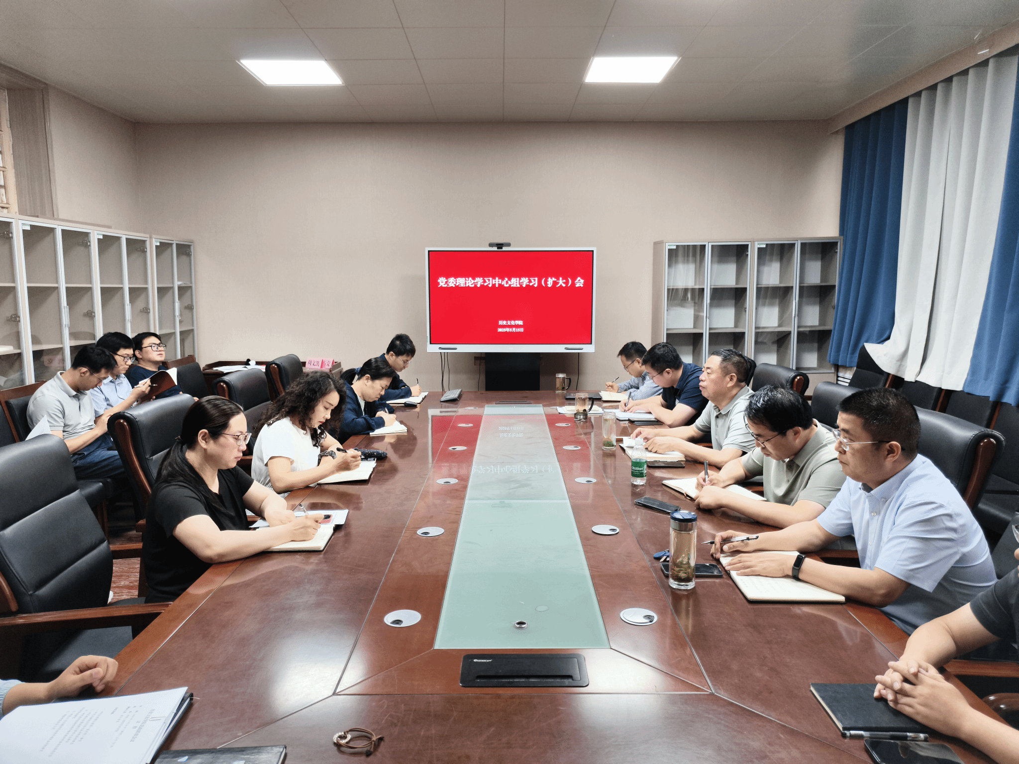 在考古文博系教研室召开党委理论学习中心组(扩大)学习会议。学院领导班子成员、各党支部书记及中层干部参会,会议由党委书记张占党主持。