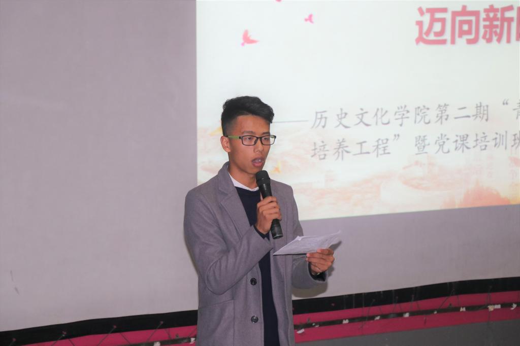 2016级何凌峰同学作为入党积极分子代表发言。他首先回顾了中国共产党带领人民不懈奋斗的光辉历程,同时结合习近平总书记的讲话引出当代大学生的历史使命,并代表学员作出承诺,将以最饱满的热情,最全面的投入,最实际的行动来完成党课的学习。