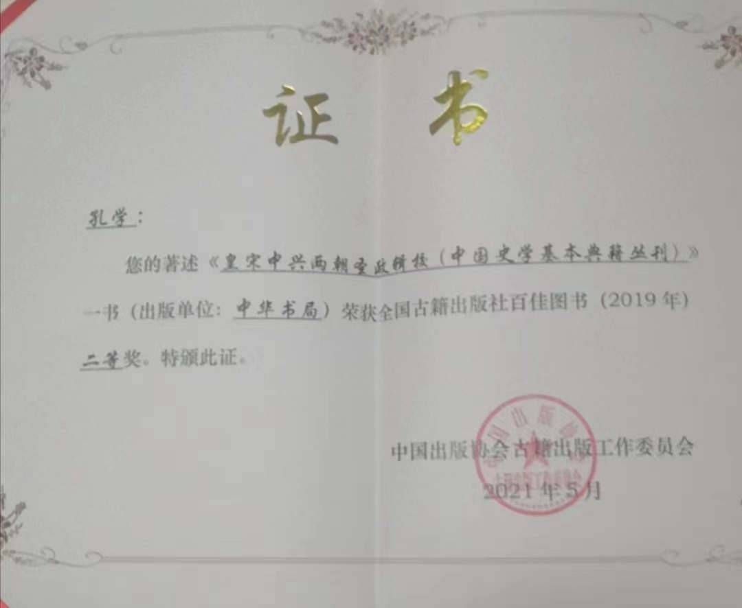 孔学副教授整理出版的《皇宋中兴两朝圣政辑校》一书荣获全国古籍出版社年度百佳图书(2019年)二等奖。