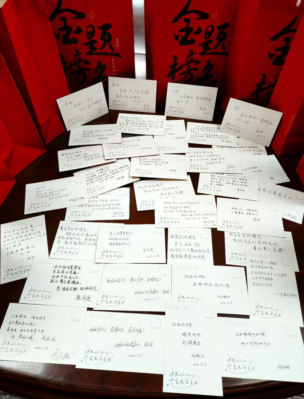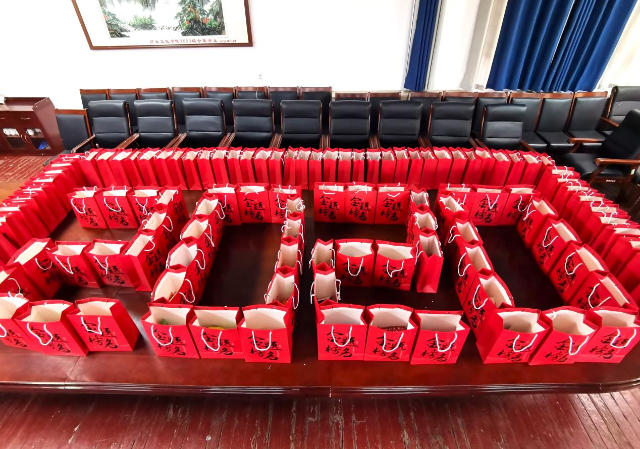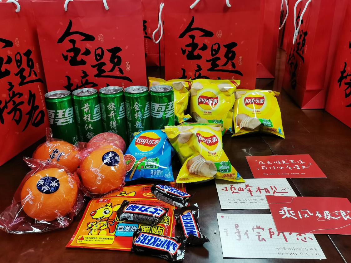 考研福袋上题有“金榜题名”“长风破浪会有时”书法字样,祝愿同学们在考研中取得优异成绩。福袋内的定制版雪碧上注有“前程似锦”“旗开得胜”等美好寄语,希望同学们“雪”以致用、“碧”操胜券;苹果和橙子寓意着考研学子们“苹”安赴考、“橙”功上岸;薯片象征着非你莫“薯”;士力架预示着同学们“士”气如虹;暖贴给寒冬紧张备考的同学们送去温暖和力量;所有福袋中还有学院领导及老师们手写的祝福语贺卡,希望同学们能够蟾宫折桂,得偿所愿。这些美好心意寄托着学院的对考研学子的殷殷期盼,支持他们矢志奋斗,考取心仪院校!