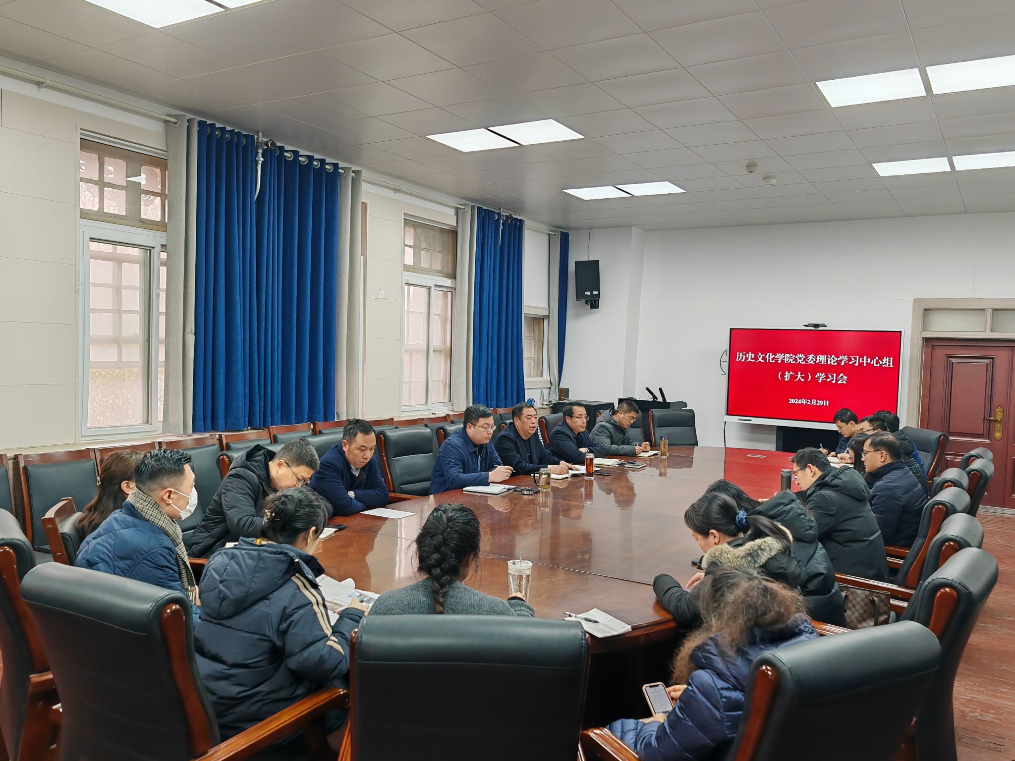 在三楼会议室召开党委理论学习中心组(扩大)学习会,全体班子成员,系(教研室)党支部书记、主任、副主任,各科室主任参加学习。