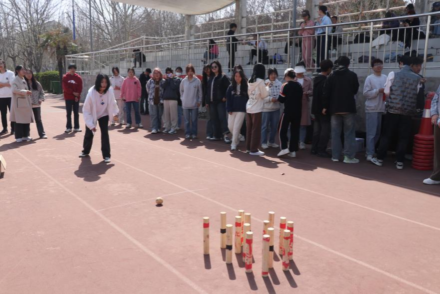 此次古代运动会共设置七个运动项目:木射、踢花毽、斗拐、投壶、行军布阵、步打球和牵钩。木射项目中,参赛选手凝神聚气,球无虚发,一个个木桩迅速倒地。而在踢花毽比赛中,同学们身姿矫健,毽飞舞间展现出优美的技艺与灵活的身姿。斗拐比赛中,选手们奋力拼搏,挥拐破风,力争取得胜利。