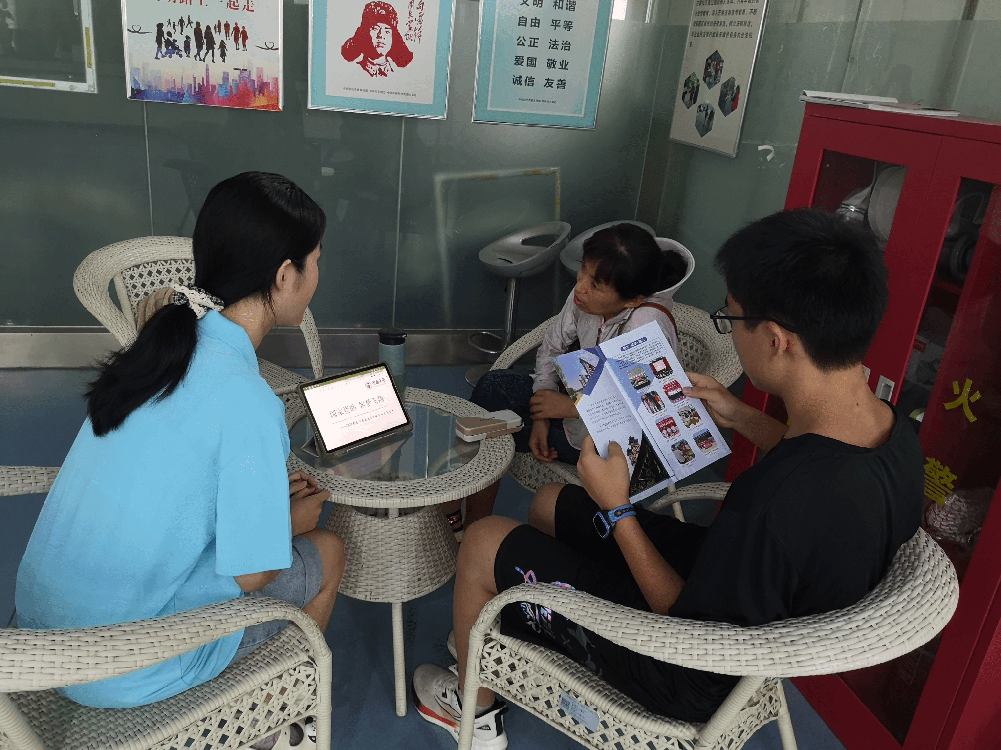 相关资助项目,向准大一新生以及学生家长介绍相关情况以及所需材料和具体流程。