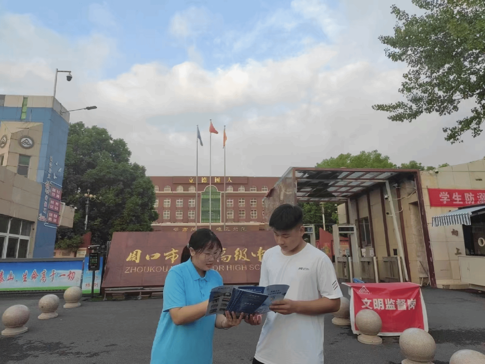 (图为张芮同学在周口市第一高级中学校门前进行线下资助政策宣传)