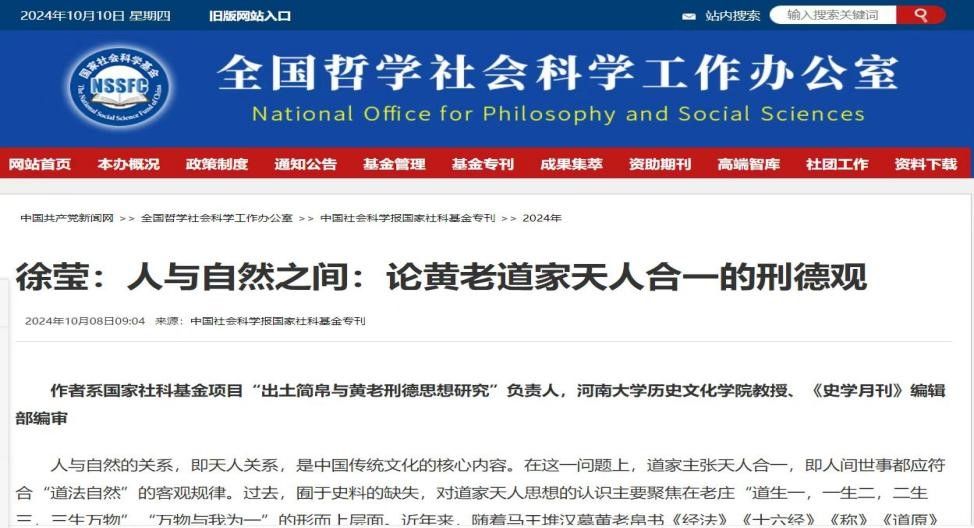 徐莹教授在全国哲学社会科学办公室官网和《中国社会科学报》同时刊发题为《人与自然之间:论黄老道家天人合一的刑德观》的文章。