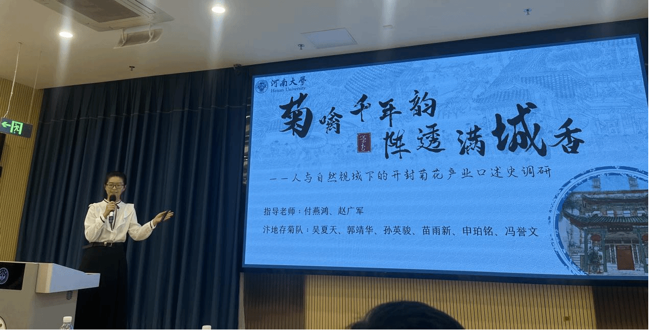 本科2022级、2023级历史学专业的吴夏天、申珀铭、苗雨新、郭靖华、孙英骏、冯誉文六位同学组成。他们以人与自然视域下的开封菊花产业为题,在付燕鸿、赵广军等老师的精心指导下,经过数月倾力投入的访谈整理、文本修订,最终形成十余万字的口述史文本《人与自然视域下的开封菊花产业口述史调研整理稿》。团队在决赛中的展讲和答辩两个环节中准备充分,发挥稳定,沉着应答,表现出色。