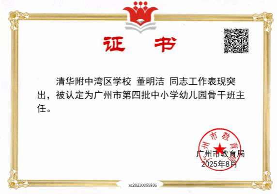 ,属于支持她创新实践的清华附中湾区学校。相信在未来,董明洁将带着“南粤优秀教师” 这份荣誉,在教育事业中继续发光发热,书写更加辉煌的篇章。