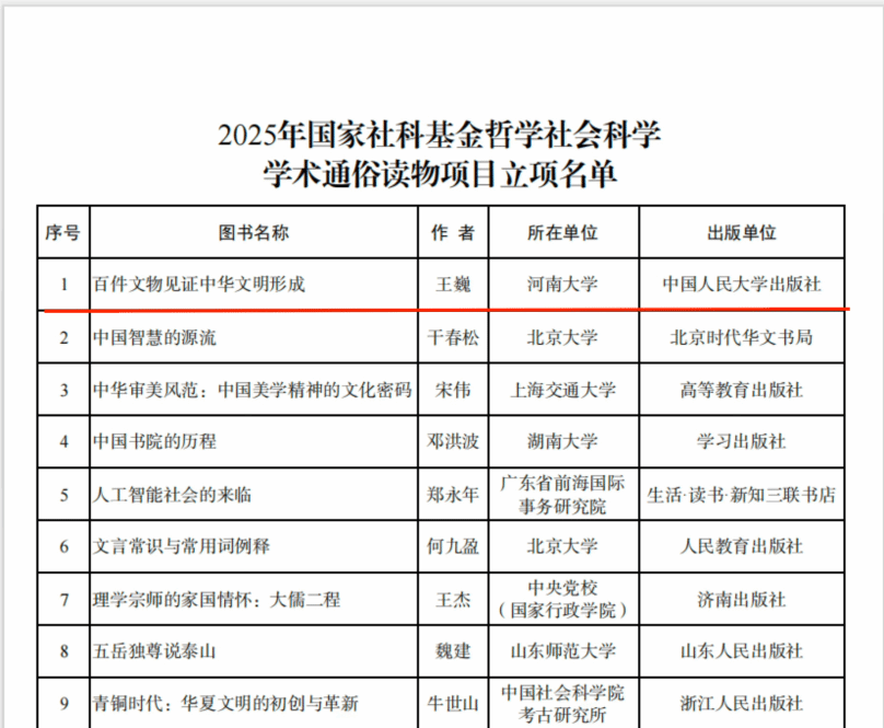 特聘教授王巍《百件文物见证中华文明形成》成功入选。