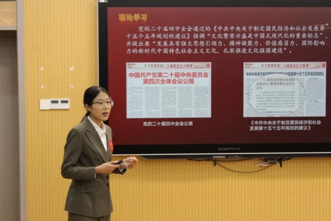 推荐的优秀代表,研究生2025级中国古代史班团支部紧扣党的二十届四中全会精神核心要义,将“发展具有强大思想引领力、精神凝聚力、价值感召力、国际影响力的新时代中国特色社会主义文化”的重要论述与学科特色、校史底蕴深度融合。比赛现场,团支书王云珊围绕“理论学习—实地探访—参观校史馆—专题研讨”四位一体活动体系进行成果展示。答辩环节,针对评委老师提出的如何将理论转化为实践成果,团支书结合本专业特色进行了回答。此次团日活动既呼应了学校深入学习贯彻党的二十届四中全会精神的工作部署,又发挥了历史学科的专业优势,以“行走的思政课”形式让理论学习走出书本、走进实践,充分展现了新时代青年团员坚定的文化自信与昂扬的精神风貌,获得评委组一致好评。