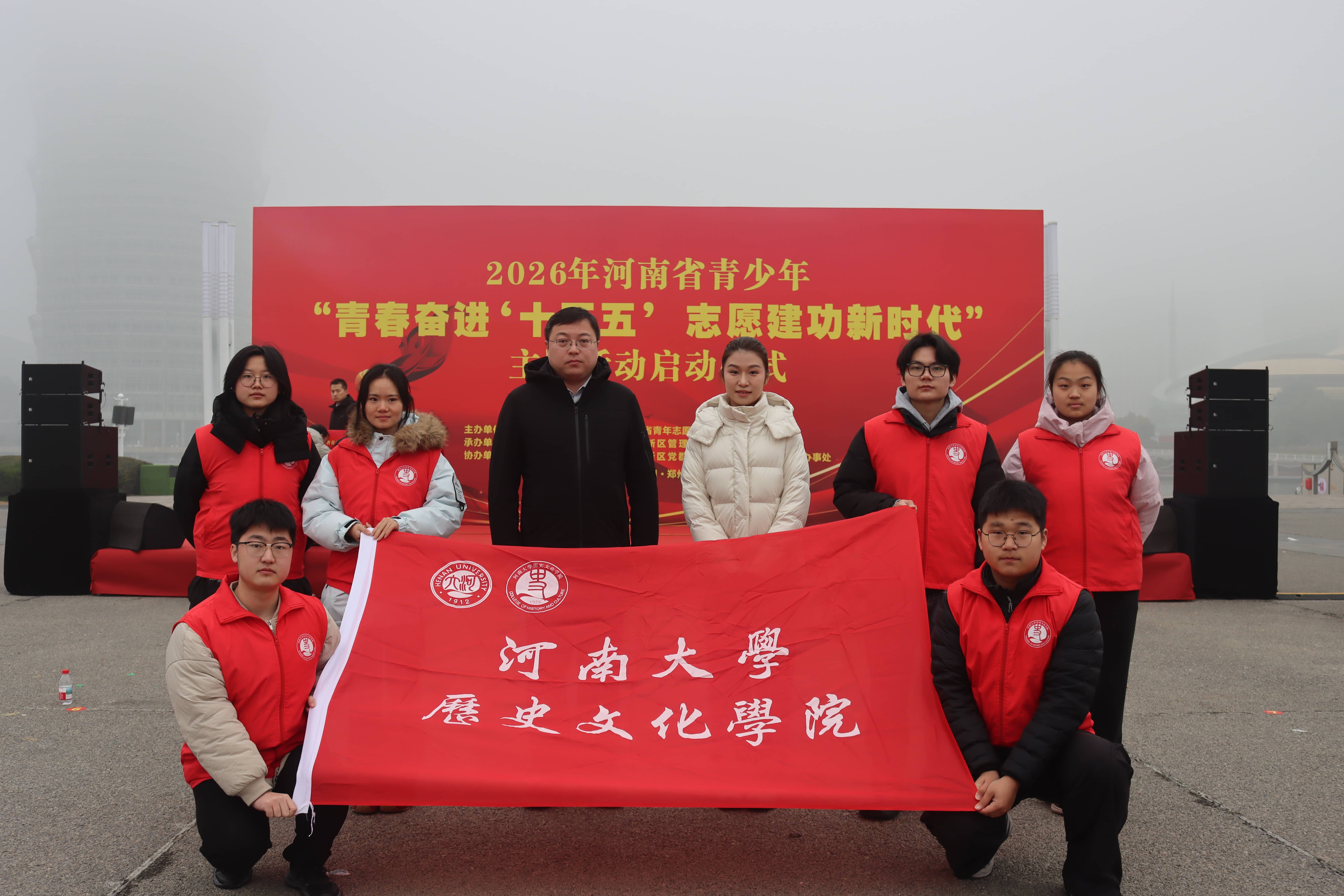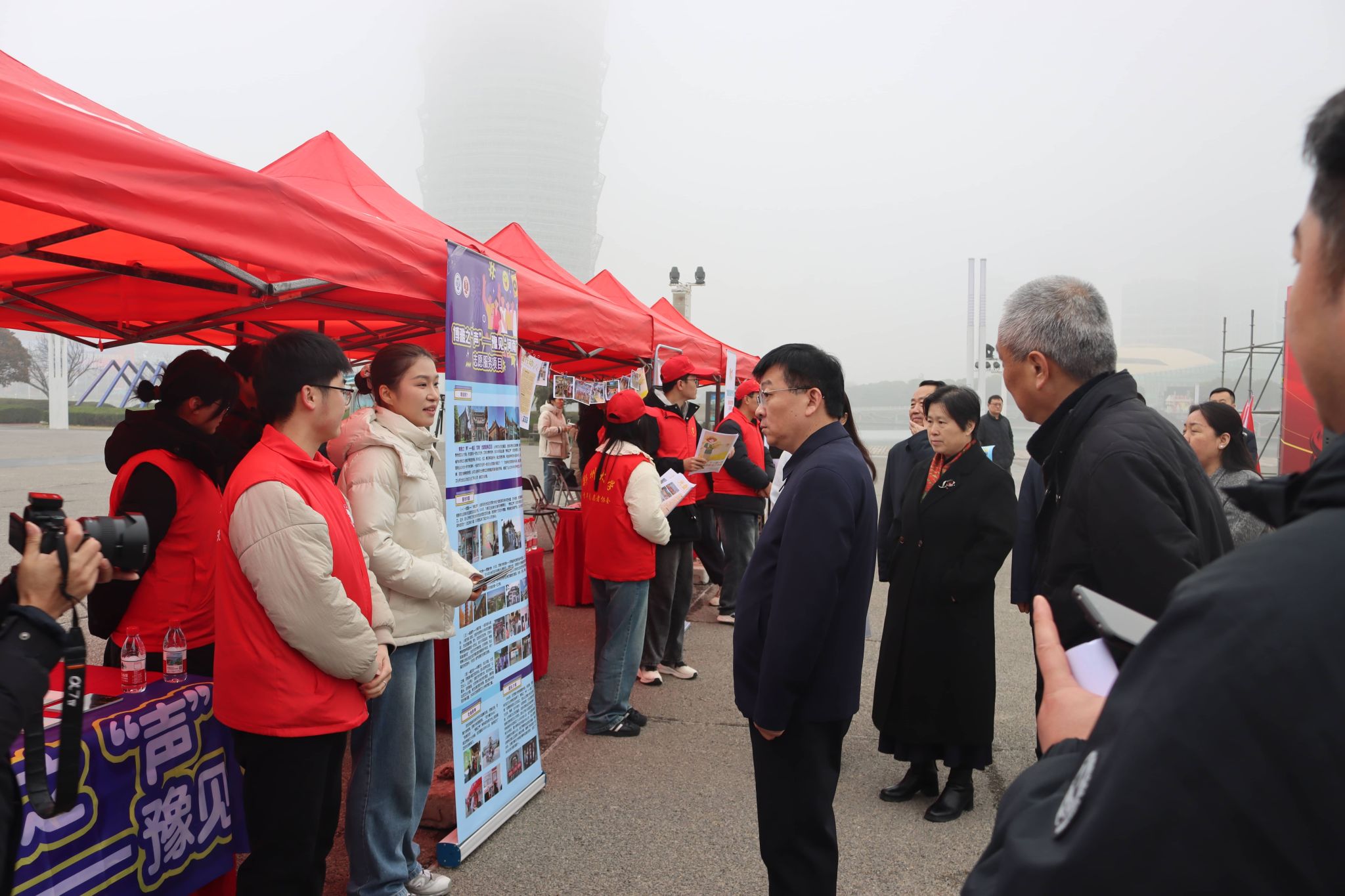 党委副书记周文凯、团委负责人林芷羽及部分学生干部,携 “博雅之‘声’—— 豫见‘河南’” 志愿服务项目应邀参加现场展示。团队依托扎实的专业底蕴与鲜活的志愿实践,向现场观众生动讲述中原文化的厚重底蕴与独特魅力。