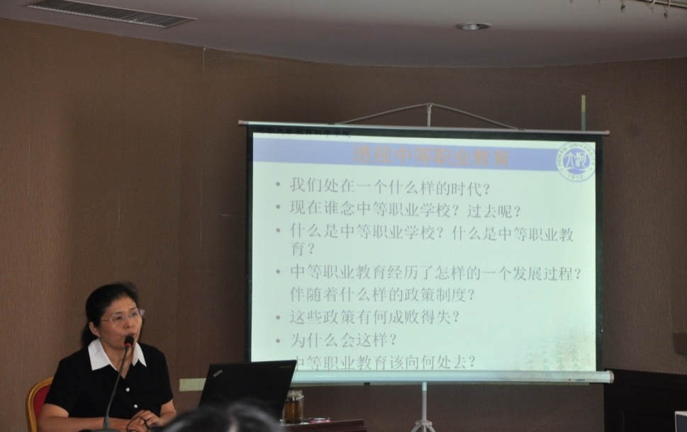 教育科学学院教授王星霞老师以《透视中职教育》为题,借助中等职业教育发展政策变化列表,串讲了改革开放以来中职教育的发展历程,并对国家中长期职业教育的核心——培养什么人,怎么培养人等重大问题展开了讨论。