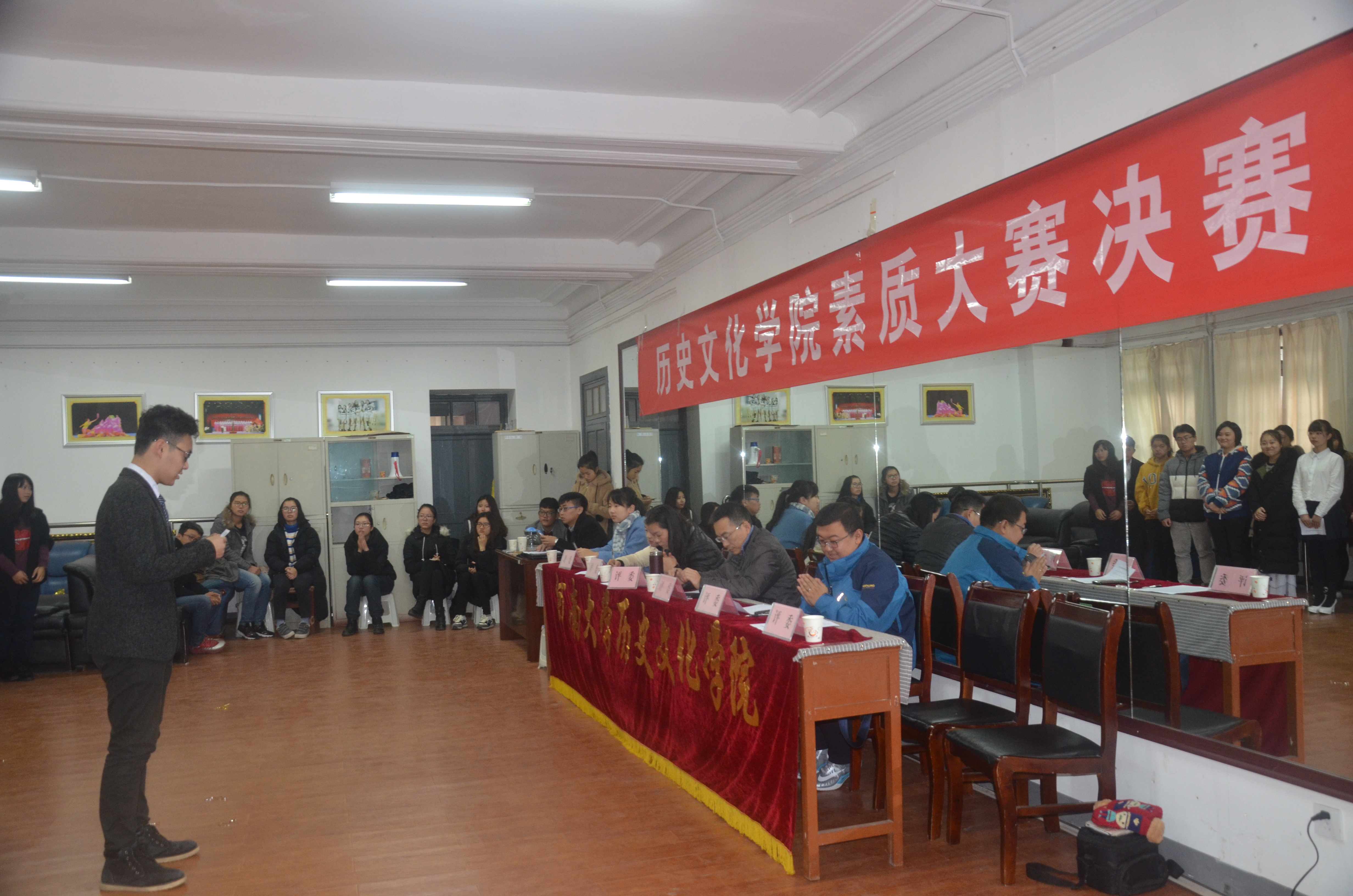 素质大赛决赛在学院105排演厅隆重举行。院党委副书记杨光辉、院工会委员、旅游管理专业教师段冰、团委书记谢宇飞出席本次活动并担任评委。