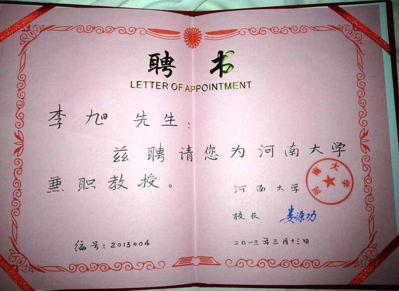 兼职教授,由时任娄源功校长签发聘书,编号2013004。