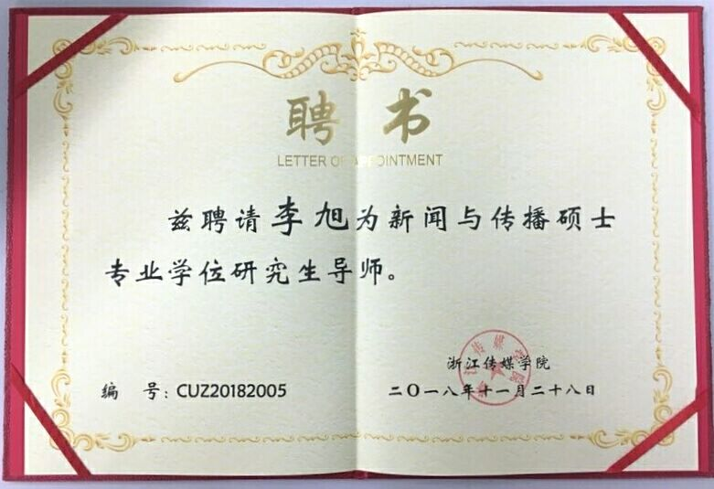 2018年李旭被聘为浙江传媒学院新闻与传播硕士专业学位研究生导师