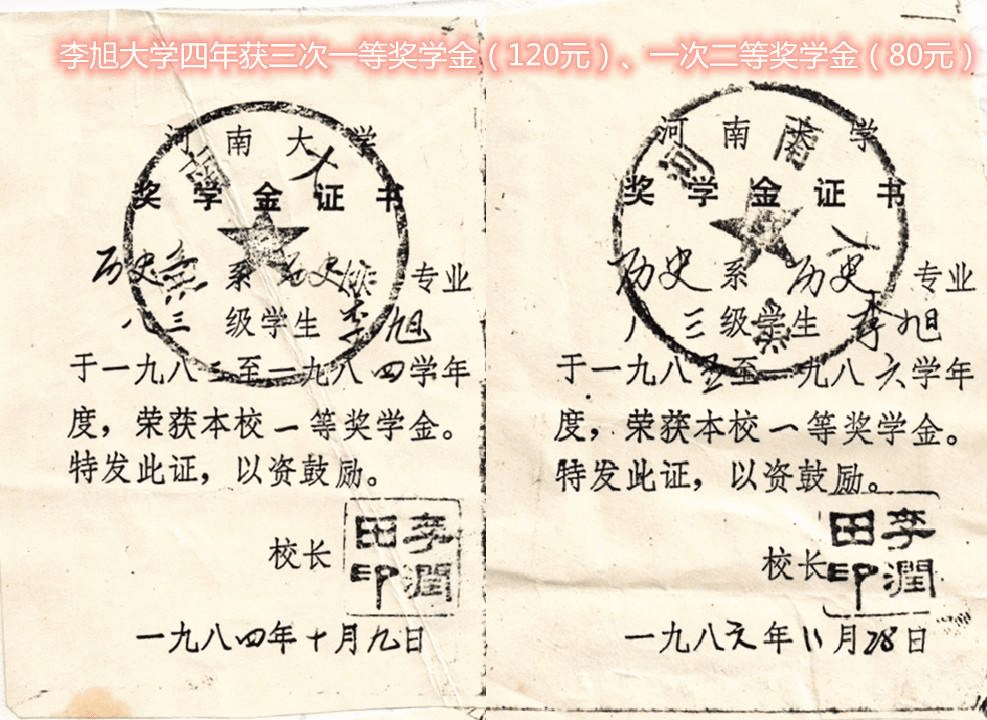 大学阶段,前两年多是公共通史课学习打基础的阶段,经过刻苦努力,取得了全年级总分第一的成绩,获得了校一等奖学金120元,第三年差一点,被一班女同学马凤实(后考上研究生,现在郑州某炮院任教员)超过了,才获得二等奖学金80元,第四年又争回了第一,获得校一等奖学金。