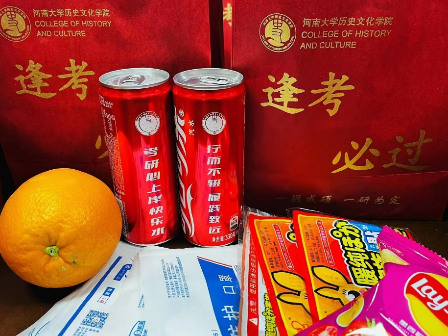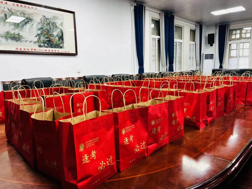 在三楼会议室为考研学子发放了精心准备的89份“考研加油福袋”,为同学们送上温暖的问候。精心设计的福袋印有学院院徽及“逢考必过”的美好祝愿;定制考研上岸版的可口可乐寓意着可“喜”可“乐”;香橙代表着心想事“橙”;口罩象征着吉星高“罩”;薯片寓意着“薯”你最牛;暖贴更是希望能为紧张复习的学子带来温暖与力量。