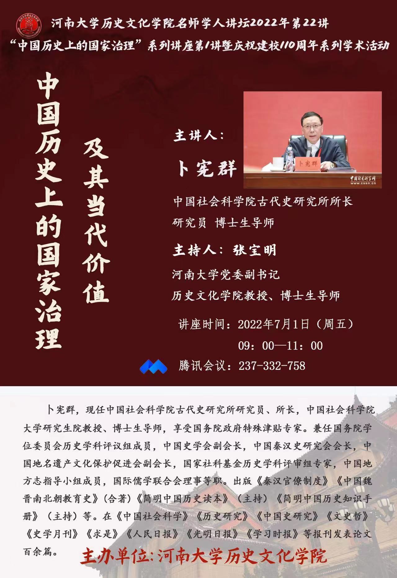 【讲座通知】卜宪群:中国历史上的国家治理及其当代价值
