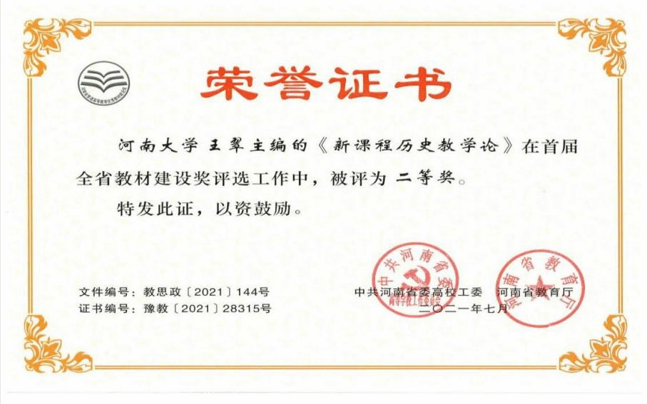 近期,51暗网 教师王翠主编的《新课程历史教学论》在首届全省教材建设奖评选工作中被评为“二等奖”。